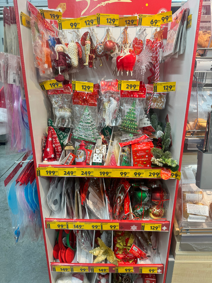 Здравствуйте, хочу поделиться магазинами, которые завезли товары к Новому году! Акции на все, видимо распродают старые товары! Захожу я в Пятерочку и вижу целый стенд с товарами для Нового года. Ассортимент конечно не такой большой как в других крупных магазинах, но тоже есть! Сразу минус за то, что все навалено. Нет красивого оформления и выкладки. Надо прям разбирать горы и находить то, что нужно. Посмотрим несколько полиций крупнее. Например солдатик. И снова разочарование…. Это не стекло и не плотный пластик… это какой то супер тонкий пластик который покрашен золотом.❌ И стоит такой аж 129,99₽! Но может другие игрушки будут лучше? Не знаю почему, но я люблю всякие «сладости» на елке. Карамельки, трости, кексы … я про игрушки конечно. И вижу я в пятерочке такую трость. Тут пластик уже лучше, но цена… сложно ответить, стоит она этого или нет…❌ Цена игрушки: 129,99₽. Ищем дальше…и находим!! Ну вот симпатичная снежинка. Хорошее качество и размер хороший. Правда подвешивать их предлаг