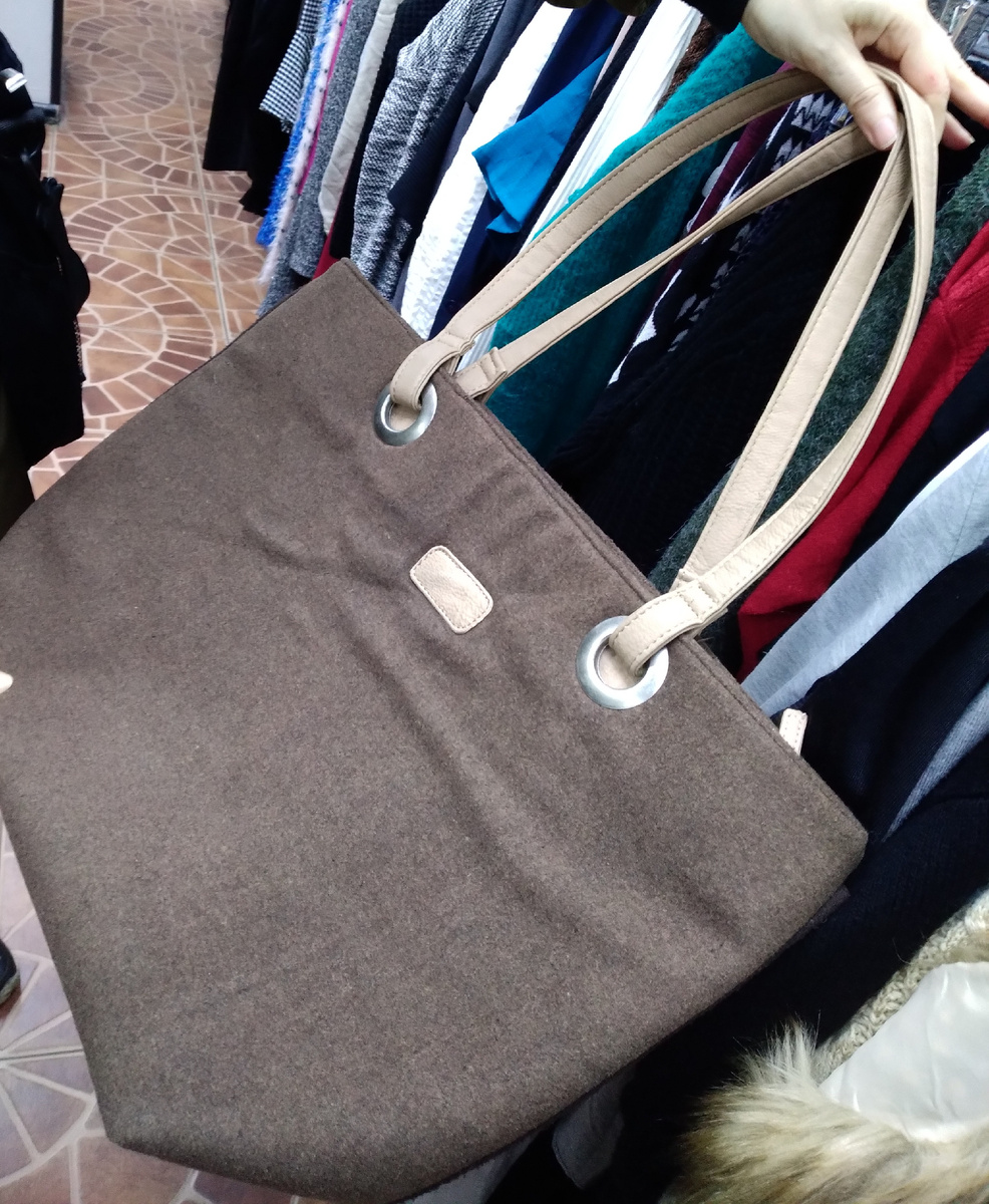 Большой серый шоппер на кнопке и с одним наружным карманом. Грубоватая, смотрится дёшево, но кажется крепкой.
