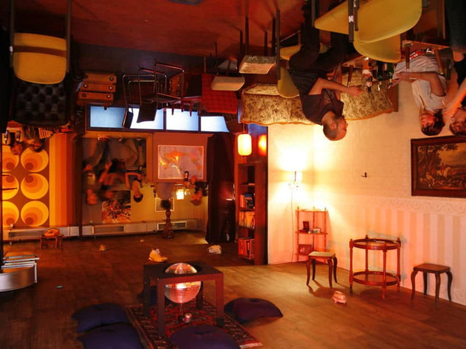 Все фото из открытых источников Интернета В этом баре у вас закружится голова еще до первой рюмки - ведь здесь все вверх ногами! В заведении, расположенное в бывшем борделе в берлинском районе Кройцберг, к потолку прибиты стулья, диваны, столы и другие предметы обстановки, из-за чего складывается впечатление, что вы постоянно находитесь вверх ногами. Заведение работает с 7 вечера и до упора, здесь проходят концерты и выступают известные диджеи. Есть и стол для пинг-понга - к счастью, установленный на полу. У меня Берлин ассоциируется именно с такими местами. Подвальный бар. Внутри приглушенный свет, Много всяких закутков с засаленными диванами и разрисованными стенами. На входе не фиксированная цена, от 2 до 10 евро. Стоит посетить, если в этом районе, даже если это просто увидеть перевернутый мир! Бар очень любопытен, с несколькими небольшими местами и концертной комнатой внизу. Все перевернуто, что может свести с ума!