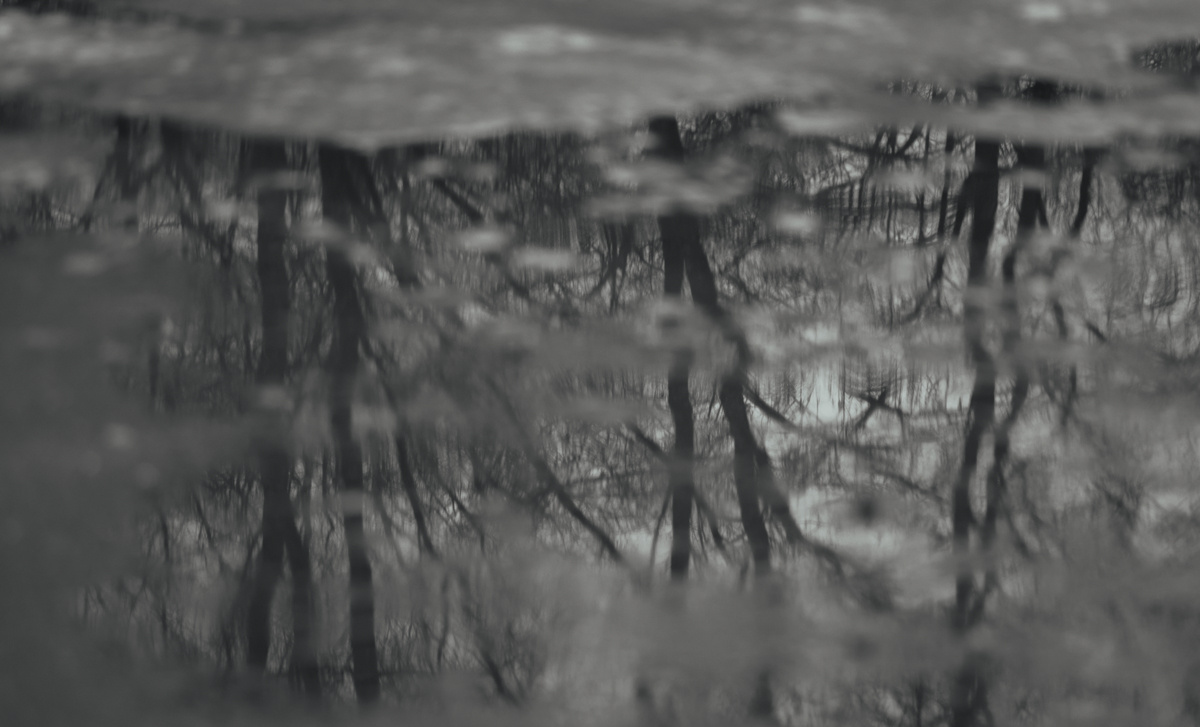 Тишина вокруг, небо - низкое, тяжёлое, серое, как положено в ноябре. На разбитом старом асфальте лужи с примесью грязных льдинок. Деревья почти без листвы. Птицы на ветках, чёрные, то ли вороны, то ли галки.