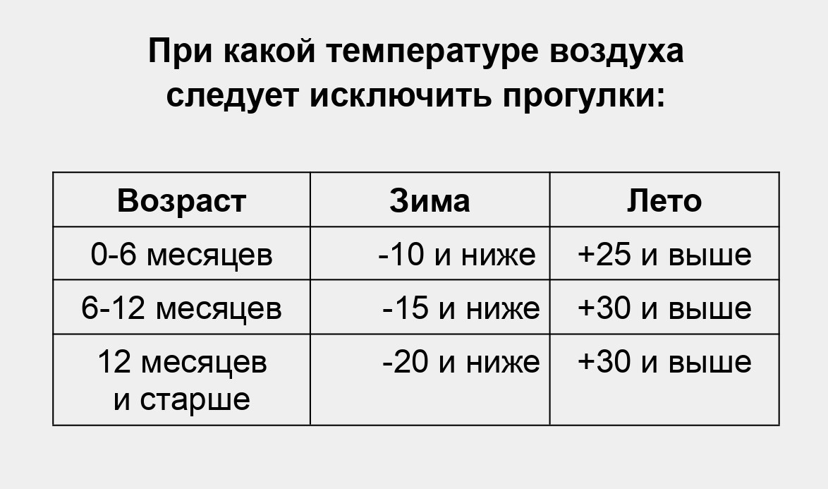 - Смотрите прогноз погоды. Ниже приложу температурную табличку. Ориентируйтесь на неё, и на личные ощущения. Прогулки лучше отменить, если поднялся сильный ветер или на улице дождь/град/снегопад. Также опасно палящее солнце. Детская кожа нежная, в летние дни обязательно наносите на открытые участки тела солнцезащитный крем с SPF 50. Даже при использовании крема избегайте прямых солнечных лучей. Лучше гулять в тени и не откидывать капюшон на коляске. Раньше была практика загорать, "показывать ребёнка солнышку", считая, что так вырабатывается витамин Д. Устаревшая, неверная информация. От прямых солнечных лучей можно получить только ожог.