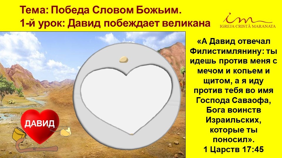 «А Давид отвечал Филистимлянину: ты идешь против меня с мечом и копьем и щитом, а я иду против тебя во имя Господа Саваофа, Бога воинств Израильских, которые ты поносил» 1 Царств 17:45. Детям Сегодня давайте узнаем историю верного слуги по имени Давид! Он был молодым человеком, который очень любил Бога и заботился об овцах своего отца. Давид был пастухом, и Бог очень любил его, потому что он был послушен и в точности исполнял волю Господа. Знаешь, что это значит? Давид был послушен Слову Божьему. Однажды у народа Божьего возникла большая проблема: против них сражалась армия филистимлян. В этой армии был великан, огромный человек по имени Голиаф. Голиаф был силен и говорил плохие вещи о народе Божьем. И народу Божьему было страшно, но Давид не боялся, потому что он доверял Господу! Давид взял с собой пять камней из реки. Когда великан Голиаф увидел Давида, он начал смеяться, думая, что Давид слишком мал, чтобы сражаться. Но Давид не боялся, потому что знал, что Бог с ним. Давид сказал