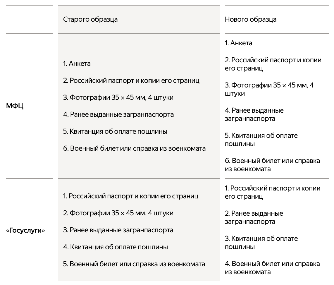 Пакет документов почти идентичен для любого способа оформления и типа паспорта.