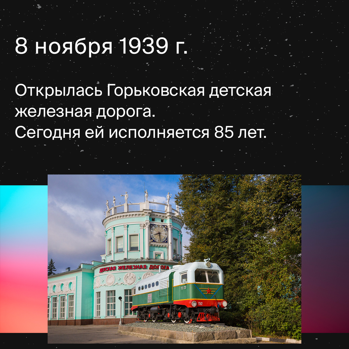 8 ноября празднуется 85-летие Детской железной дороги, которая дарит радость и удивительные воспоминания детям! В 1939 году, 8 ноября, на праздник торжественного открытия Малой Горьковской дороги собрались гости из 11 городов страны и районов области. В 14:02 от перрона станции «Родина» отправился первый поезд, ведомый юной машинисткой, пионеркой Женей Герман. Новая детская железная дорога поражала своей технической оснащенностью: главная станция «Родина» имела три приемоотправочных пути, что в то время было редкостью для детских железных дорог. Подробнее о истории ДЖД в наших карточках!