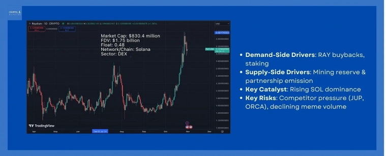 Перед тем как вы погрузитесь в изучение статьи, обратите внимание на тот факт что всё упомянутое в ней не является финансовой рекомендацией для принятие более взвешенного решения просьба провести свое собственное исследование. ________________________________________________________________________ В этом цикле SOL захватила интерес розничной торговли, чему способствовали всплеск мемов на SOL и низкие комиссии за транзакции. Ключевые показатели - доход и количество активных пользователей - достигли рекордных уровней. По мере того как SOL набирает обороты, в проекты, основанные на SOL, начинает поступать ликвидность, что способствует дальнейшему росту. RAY, DEX на базе Solana, лидирует с 62 % объема сделок. Его сильная позиция в экосистеме SOL делает его идеальным бета-активом для SOL. Ценовая динамика RAY в точности повторяет динамику SOL, а недавно даже превзошла ее. 13 августа наша команда опубликовала глубокий анализ RAY по цене $1,536; сейчас он вырос более чем на 100 %. (статья от