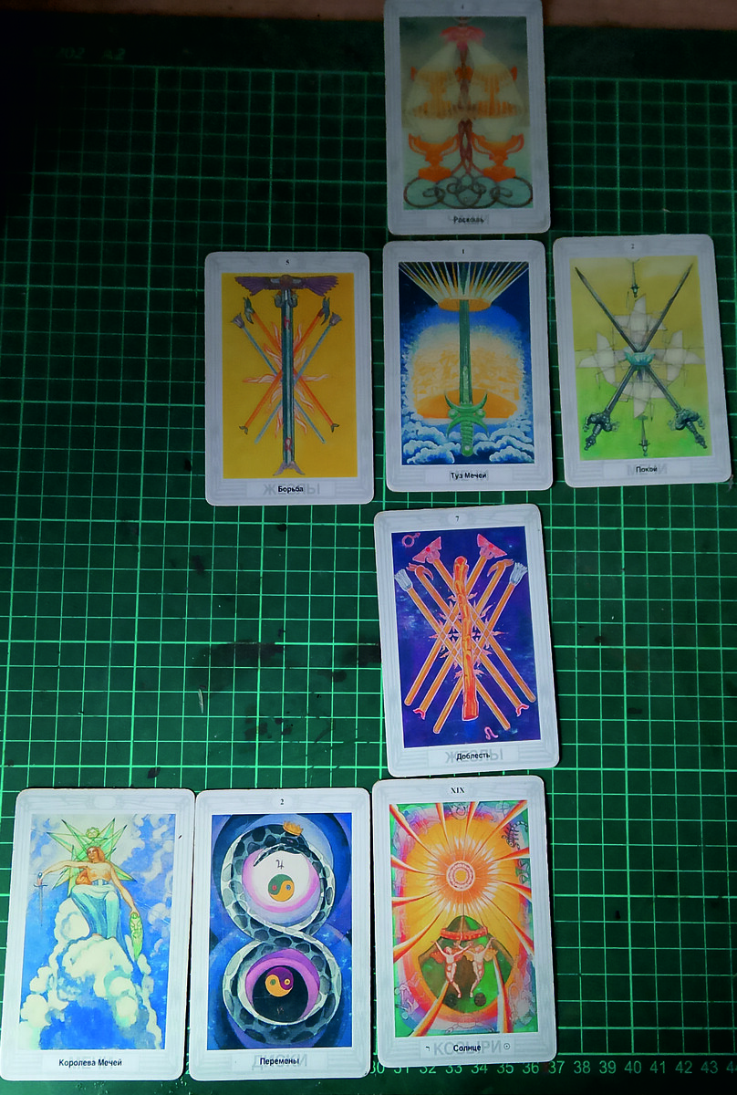 Таро – буквы, разные по силе и значимости, они приобретают смысл и действенность только когда их слагают в слова, сами же по себе это просто звуки, мы можем узнать, что скрыто под их написанием только когда умеем складывать их вместе, или сливать их в слово. Понятно, что «умение читать», – условность, фигура речи, и она обозначает способность сказать. Мы делаем временные связки, отвечаем на вопрос что будет если, или что было-бы если. Каждый из нас сталкивался с ситуацией, когда эти прочитанные слова, предложения, и, даже абзацы, независимо от трактующего, очень точно повторяются реальностью, тогда Вы называете их удачными мыслями. «Удачность» определяется лишь степенью Вашей веры в себя. Что у нас сегодня в изначальных данных по определению? Вы, как вода ветра, Королева мечей, или мыслей. В правой руке у Вас мысль (та самая связка), а в левой руке голова поверженного ею мужчины. По поводу композиции, она зрительно смещена в правый верхний угол, самый тёплый элемент - верхняя часть В
