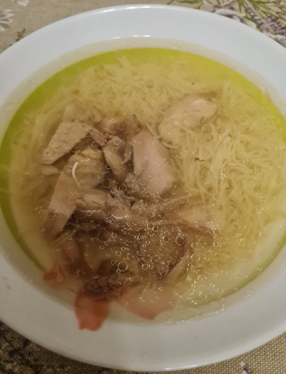 Для приготовления 3-х литровой кастрюли нам понадобится: Курицу кладем в кастрюлю, заливаем водой, добавляем луковицу и крупно порезанную морковь. При закипании снимаем пену, делаем огонь под кастрюлей на минимум, варим 2,5 часа (овощи через час можно вытащить и выбросить, можно это сделать позже). Готовую курицу достаем, отделяем мясо от костей. Мясо отправляем обратно в бульон, солим по вкусу, кипятим, выключаем кастрюлю. Наш вкусный бульон готов к употреблению. Отвариваем макарошки, как указано на упаковке производителя. На тарелку выкладываем макарошки, наливаем бульон и с удовольствием кушаем. Приятного аппетита!