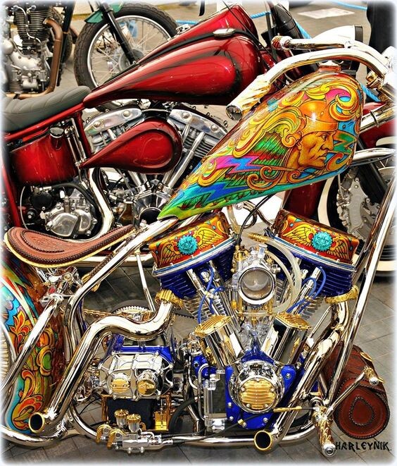 На канале уже была отдельная статья Что такое чоппер? Чоппер не может быть стандартным и заводским. Это по определению кастомизированный мотоцикл. Чоппер предполагает акцент на механизмах и функциональных элементах, но не обязательно с упором в технические характеристики. Например, как двигатель работает и выглядит важнее того, сколько лошадиных сил на килограмм веса он выдаёт. Начну серию постов с картинками, где будут показаны отдельные элементы эстетики чопперов. Яркие, необычные, привлекающие взгляд. Главное - это внимание к деталям! Где-то вся соль в раскраске. Где-то необычное техническое решение. Другие статьи на канале: Популярное на канале Мотоинтервью Мотофилософия Мотобезопасность Мотокино Мотостихи Мотоюмор Мотокниги Присоединяйтесь к чату канала Moto_Ogr в телеграмме. Там вы сможете стать участником проекта "Интервью с мотоциклистом". Поддержать развитие канала: