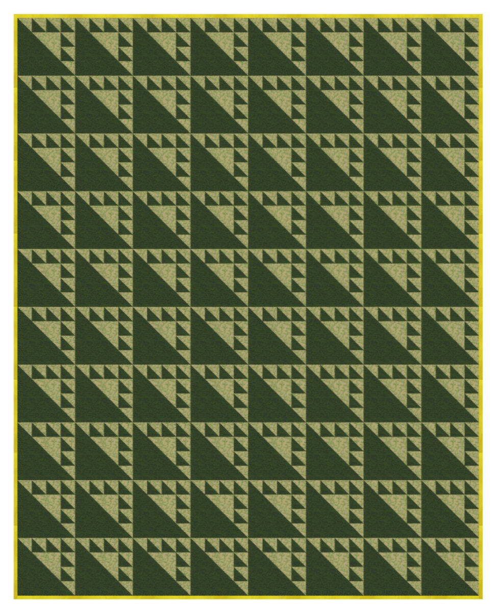 От windhamfabrics.com Дизайнер Heather Ross. Готовый размер изделия: 64” x 80”. Здесь представлено цифровое изображение. Ткани проекта могут меняться. Размер одного готового блока 8” x 8”. Выкраиваемый размер включает 1/4 ” прибавки на швы с каждой стороны. Ваша раскладка блоков и само изделие могут отличаться от этого проекта в зависимости от выбранной ткани. Расход ткани: здесь расход ткани дан исходя из ширины американского хлопка 42-44” или 110 см. Ткань А – здесь темно-зеленая 15 полос размером 3” на всю ширину ткани, разрезать на 200 квадратов 3”; 10 полос размером 9” на всю ширину ткани, разрезать на 40 квадратов размером 9”. Каждый квадрат разрезать один раз по диагонали, чтобы получить 80 треугольников. Ткань В – здесь светло-зеленая 5 полос размером 5” на всю ширину ткани, разрезать на 40 квадратов 5”. Каждый квадрат разрезать один раз по диагонали, чтобы получить 80 треугольников. 20 полос размером 3” на всю ширину ткани, разрезать на · 200 квадратов 3” · 80 квадратов 3”
