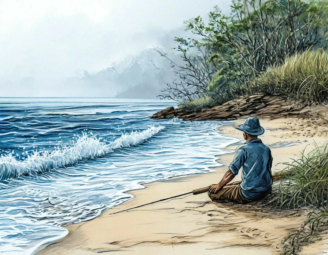 На тихом и солнечном пляже лежал рыбак. Он наслаждался тёплыми лучами солнца, слушая звук волн, а его удочка была аккуратно закреплена в песке. Легкий ветерок приносил аромат моря, и рыбак с улыбкой смотрел на горизонт, мечтая о том, что вскоре ему повезет поймать рыбу.