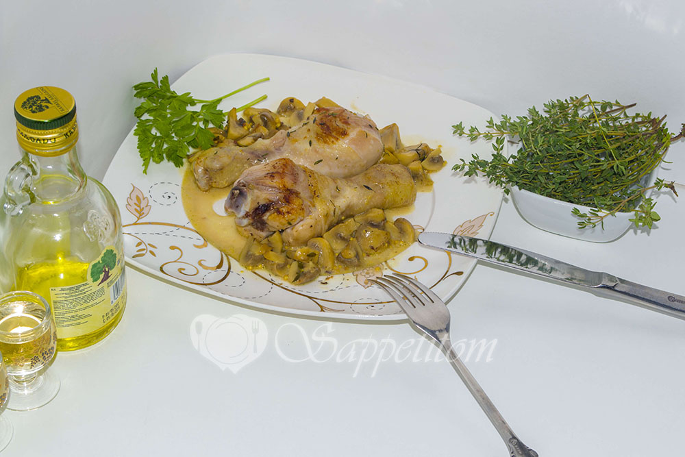 Нежные куриные голени с красивой румяной корочкой, горчично-грибной соус к ним - тут и гарнир никакой не нужен. Если все правильно приготовить, то у курочки даже получиться хрустящая корочка. Все это тушится в белом вине со сливками и веточками тимьяна - очень вкусное сочетание продуктов в одном блюде ... Мммм! Курочка с грибами получается аппетитной, необыкновенно ароматной, сытной и по-настоящему вкусной. Вместо куриных голеней вы можете взять совершенно любые части куриной тушки - крылышки, бедра. Но вот куриную грудку готовить по такой технологии я бы не советовала, на мой вкус мясо получится суховатым. Вместо универсальных шампиньонов идеально подойдут лесные грибы. куриные голени - 8 шт.