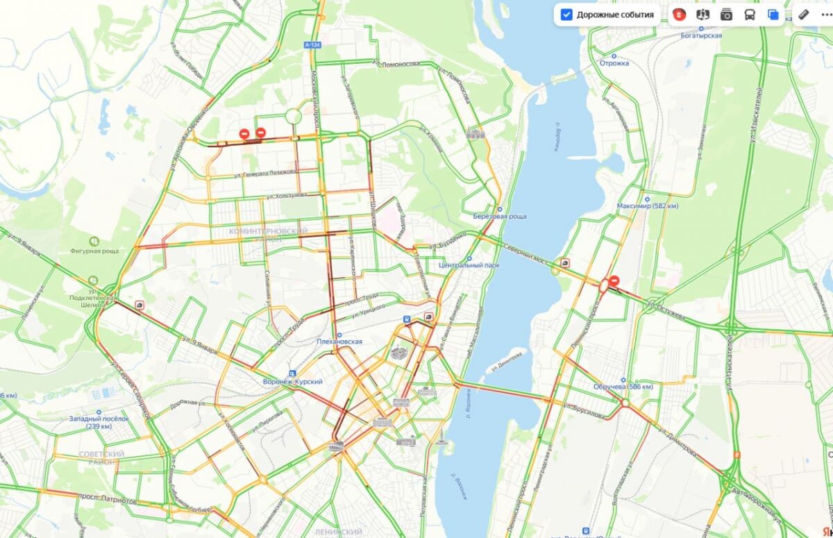 Пробки снова сковали дорожное движение в городе вечером 8 ноября. Согласно данным "Яндекс Карт", загруженность движения в Воронеже на 18:00 часов оценивается в 8 баллов. Труднее всего проехать в Центральном и Коминтерновском районах города. Огромные заторы замечены на улице Плехановской. Особенно загружено движение на ее пересечении с улицей Донбасской. Также движение осложнено на улицах Кольцовской, Пушкинской, Никитинской, Чернышевского, Пятницкого, Чайковского, Куцыгина, Феоктистова, Красноармейской, Мира и Софьи Перовской. Причиной одной из пробок на Кольцовской, по данным "Яндекс карт", является ДТП в правом ряду. В Коминтерновском районе заторы сковали автомобильное движение на Московском проспекте, проспекте Труда и бульваре Победы, а также на улицах 45-й Стрелковой дивизии, Хользунова, Шишкова, Беговой, 9 Января, Карпинского, Лидии Рябцевой, Электросигнальной, Дружинников, Машиностроителей и Ипподромной. Сообщают, что причиной пробки на Хользунова стала автомобильная авария в