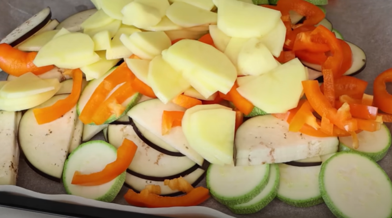 Далее очищаем два средних клубня картофеля и также нарезаем их на тонкие кольца или полукольца, если это необходимо. Яркий болгарский перец, будь то красный или оранжевый, нарезаем тонкими полосками. Затем берем форму для запекания, выстилаем ее пергаментной бумагой и аккуратно перекладываем все подготовленные овощи. Перец добавляем к кабачку и баклажану, а нарезанный картофель также отправляем в общую массу.