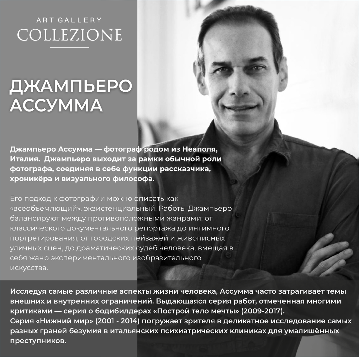 PRESS RELEASE 6 ноября 2024 года в Арт галереи «КОЛЛЕКЦИЯ» состоится вернисаж выставки «ЗА ЗЕРКАЛОМ» итальянского фотографа, мэтра стрит-фотографии ДЖАМПЬЕРО АССУММА. Творчество Джампьеро Ассумма, с многочисленными публикациями, лекциями и выставками, завоевало мировое признание, выходя за рамки простого фотографа документалиста: его работы транслируют глубокое сопереживание сложностям человеческих судеб и пропитаны живым любопытством наблюдателя, исследователя и творца. Первый приз на престижном венгерском конкурсе репортажной фотографии Hungarian Press Photo Contest получила серия «Homeless City» (2018-2019), посвящённая повседневной жизни бездомных. Тем не менее, даже самые суровые снимки Джампьеро Ассумма созданы через призму глубоких познаний и взгляда мечтателя, размывающего границы между реальностью и восприятием. С тех пор, как Джампьеро Ассумма переехал в Москву (2019), фокус его внимания переместился на яркие образы российской столицы. На вернисаже в Арт галерее "КОЛЛЕКЦИЯ" Д