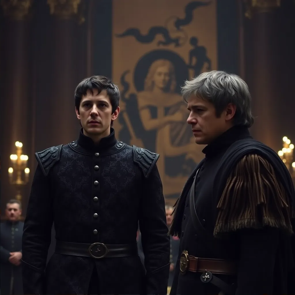 Джоффри Баратеон, облаченный в тяжёлый бархат и длинный плащ, олицетворял королевскую власть и капризы юности. Его камзол был покрыт золотыми львиными символами. Улыбка на его лице больше напоминала хищное выражение, чем искреннее счастье. Он окинул взглядом толпу, как бы требуя поклонения от всех присутствующих, и его глаза искрились от безумного восторга и многозначительности.