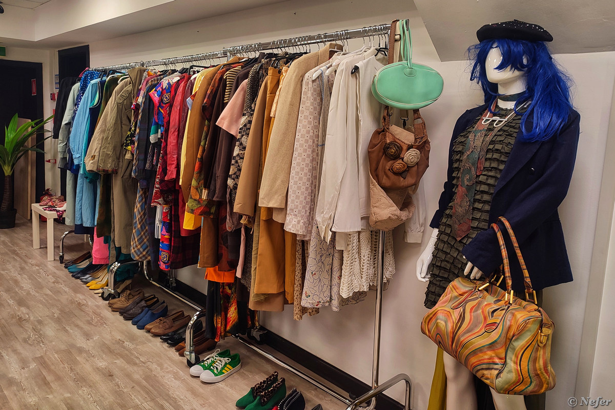 В прошлом году ретромаркет проводили один раз летом, осенью не было. А в этом году аж два ретромаркета. В эти дни магазин выделяет отдельную зону, где вывешивает одежду 70-х, 80-х и 90-х годов. Еще есть обувь и аксессуары, иногда попадаются сумки. Для желающих включают старые советские фильмы, можно посидеть посмотреть на диванчике.