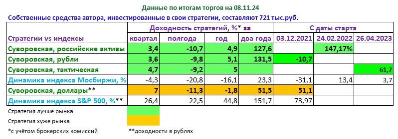 Общая сумма моих собственных средств, вложенных в Суворовские стратегии автоследования в Финаме составляет 721 тыс.руб. Объём растёт по мере роста результатов стратегий, выводить средства не планирую. Зарабатываю вместе со своими подписчиками! Стратегии на российские акции стабильно показывают результаты значительно лучше рынка (индекса Мосбиржи). Стратегия же на американские акции отстаёт от индекса S&P500, здесь буду менять подход к выбору акций для улучшения результатов.
