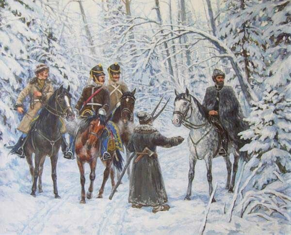 - Обоз французский караулим, а еще фуражиров и дезертиров ловим. Французам в Москве голодно, вот и посылают по деревням за провизией и фуражом, а мы тут как тут. Сейчас караулим обоз из Смоленска. У Сосновки его видели, мы его здесь перехватим. Только, видишь, метель разыгралась, вот и заплутали мы немного. Послал мужиков дорогу на Сосновку разведать, а они вас привели. Кстати, вы так и не представились.