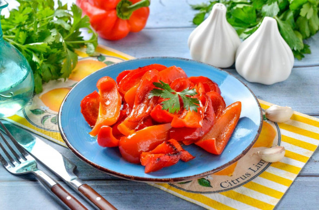 Быстро, вкусно, аппетитно - это все про наш сегодняшний рецепт. Это одна из самых лучших закусок, что я видел. Попробуйте ее же и вы! Вначале разогрейте масло в сковороде и положите чеснок. Обжарьте его пару минут и уберите. Затем положите перец, заранее нарезанный дольками. Жарьте его примерно 20 минут на среднем огне. Главное - не накрывайте крышкой. В финале Добавьте специи, уксус, сахар и перемешайте. Когда все расплавится, выключайте огонь. Приятного аппетита!