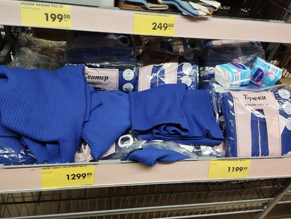 Вся одежда выполнена в синем цвете, фасон у нее а-ля оверсайз, поэтому чувствовать себя в ней мы будем свободно, движения она не сковывает. Ткань не самая мягкая, но штаны, на мой взгляд, идеальная покупка для холодной погоды, они и с ботинками хорошо смотрятся, и подходят для длительных прогулок. Размерный ряд хороший, он включает в себя размеры с 46 до 54 (причем в магазине, где я была, в наличии пока еще все).
