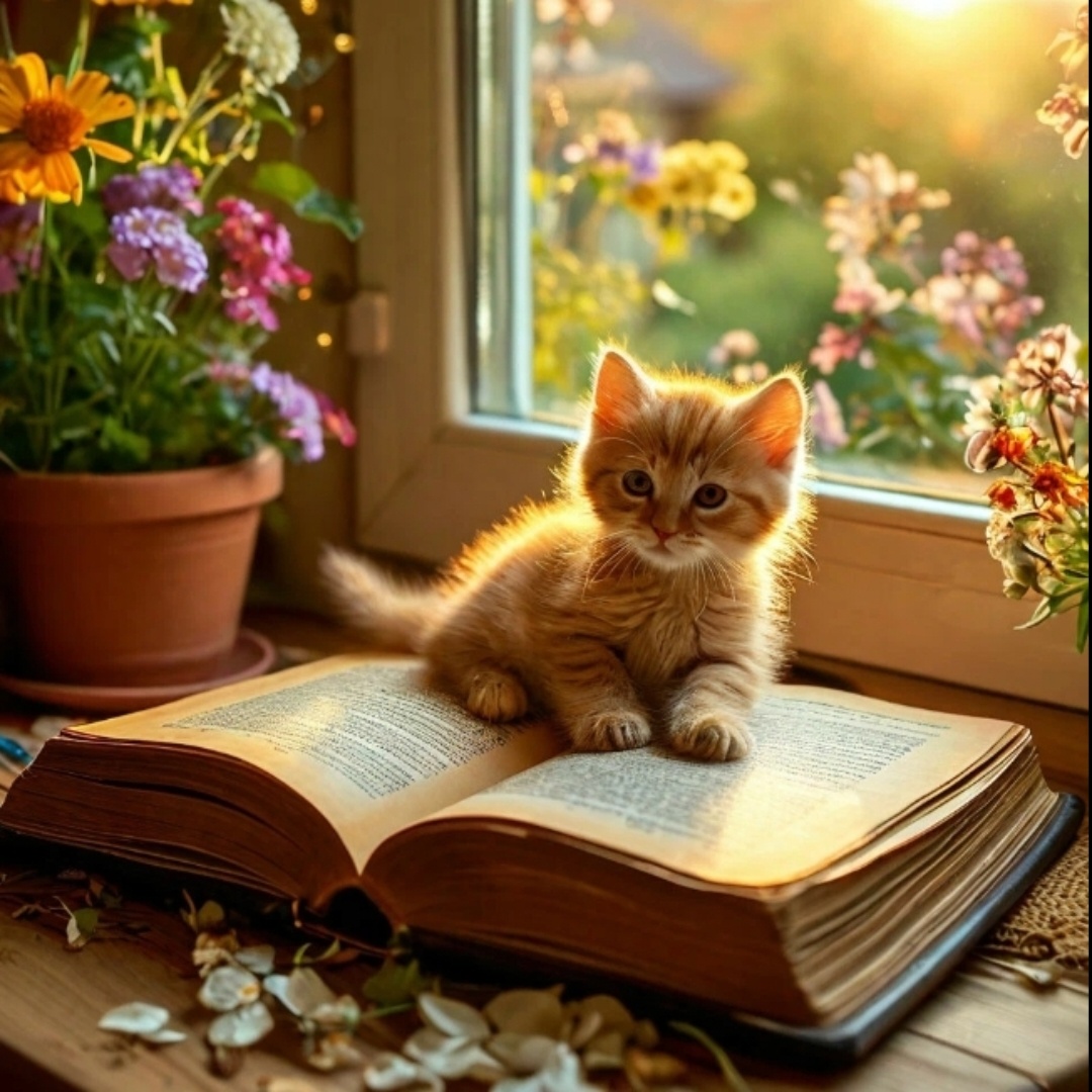 Книга, лежащая на столе, была толстой и интересной. Она была открыта на середине, и я мог видеть яркие картинки и интересные тексты. Стол стоял около большого окна, через которое я мог наблюдать летний закат и цветы, растущие за окном. Рядом с книгой лежал рыжий котенок, который играл с книжной закладкой. Он был очень забавным и игривым, и мне нравилось смотреть, как он бегает за закладкой по столу. Я решил почитать книгу, но не мог сосредоточиться на чтении, потому что котенок постоянно отвлекал меня. Поэтому встал, чтобы пойти на прогулку и отдохнуть от книги и котенка. Когда вернулся, котенок все еще играл с закладкой, но книга уже была закрыта. В конце дня я решил не возвращаться за стол, а пошел на кухню, чтобы выпить чашку чая перед сном. Мой маленький друг не захотел составить мне компанию. Наигравшись, он заснул прямо на книге, свернувшись в клубок. "Милый малыш, как я рад, что ты появился в моем доме! "