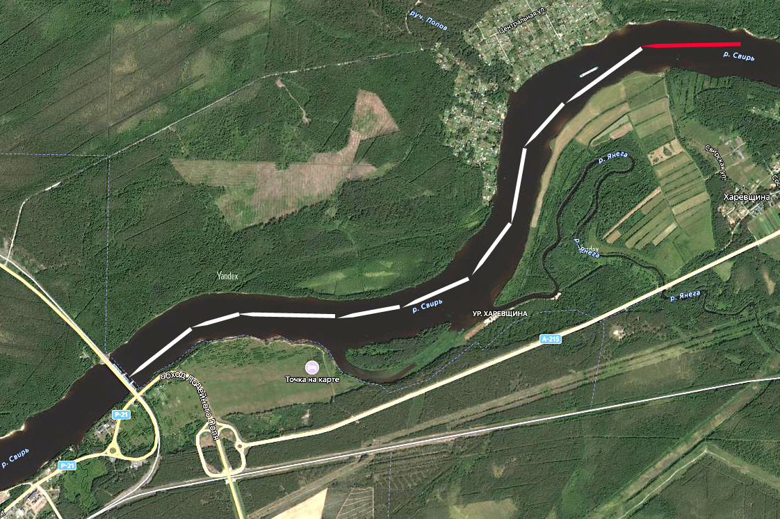 Продолжаем наше виртуальное плавание от Нижне-Свирского гидроузла вниз по Свири. В предыдущей статье мы полюбовались природными красотами, и продолжим это делать ещё на протяжении пяти километров, а в конце сегодняшнего маршрута подойдём к нашей цели – Лодейнопольскому мосту. Проходим знак «Ориентир», чёрно-белый знак установлен у левого берега. До моста – чуть меньше 5 километров. Знак «Ориентир» на реке — это береговой навигационный знак для обозначения характерных мест (мысы, острова, полузапруды, дамбы и т.п.), расположенных на судоходном пути. Примерно через полкилометра на левом берегу - рыбаки, обустраивающие свой лагерь. Рядом рыбалка уже в разгаре. Собака и её хозяин что-то увидели (или услышали) справа от себя, собака даже голос подала. Слева по борту – турбаза «Приостровское» (отдых на ферме, как пишут сами хозяева) в урочище Харевщина деревни Харевщина. Сама деревня Харевщина относится к Янегскому сельскому поселению Лодейнопольского района Ленинградской области, рсположена