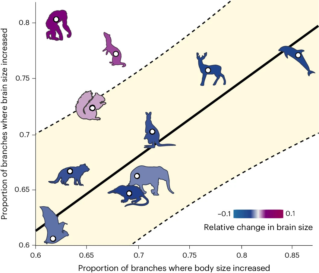 (Результаты: нейрофизиология. «ХиЖ» 2024 №10) Более крупный по отношению к размеру тела мозг связан с интеллектом, социальностью и сложным поведением. У людей мозг всегда был исключительно большим. Однако, несмотря на широкие исследования, ученые не понимают связи между массой мозга и массой тела у млекопитающих. Более века биологи полагали, что эта связь линейна, то есть чем крупнее животное, тем пропорционально больше размер его мозга. Чтобы прояснить вековые споры на эту тему, исследователи из Университета Рединга и Даремского университета под началом профессора Роберта Бартона (Robert A. Barton) собрали данные о размере мозга 1500 видов животных. Оказалось, что график зависимости его относительной величины от размера тела имеет вид выпуклой загибающейся кривой, причем человек здесь не исключение. Мозгу крупных животных что-то мешает становиться очень большим. Пока неясно, происходит ли это потому, что он слишком дорог энергетически. Однако единая закономерность означает, что относи