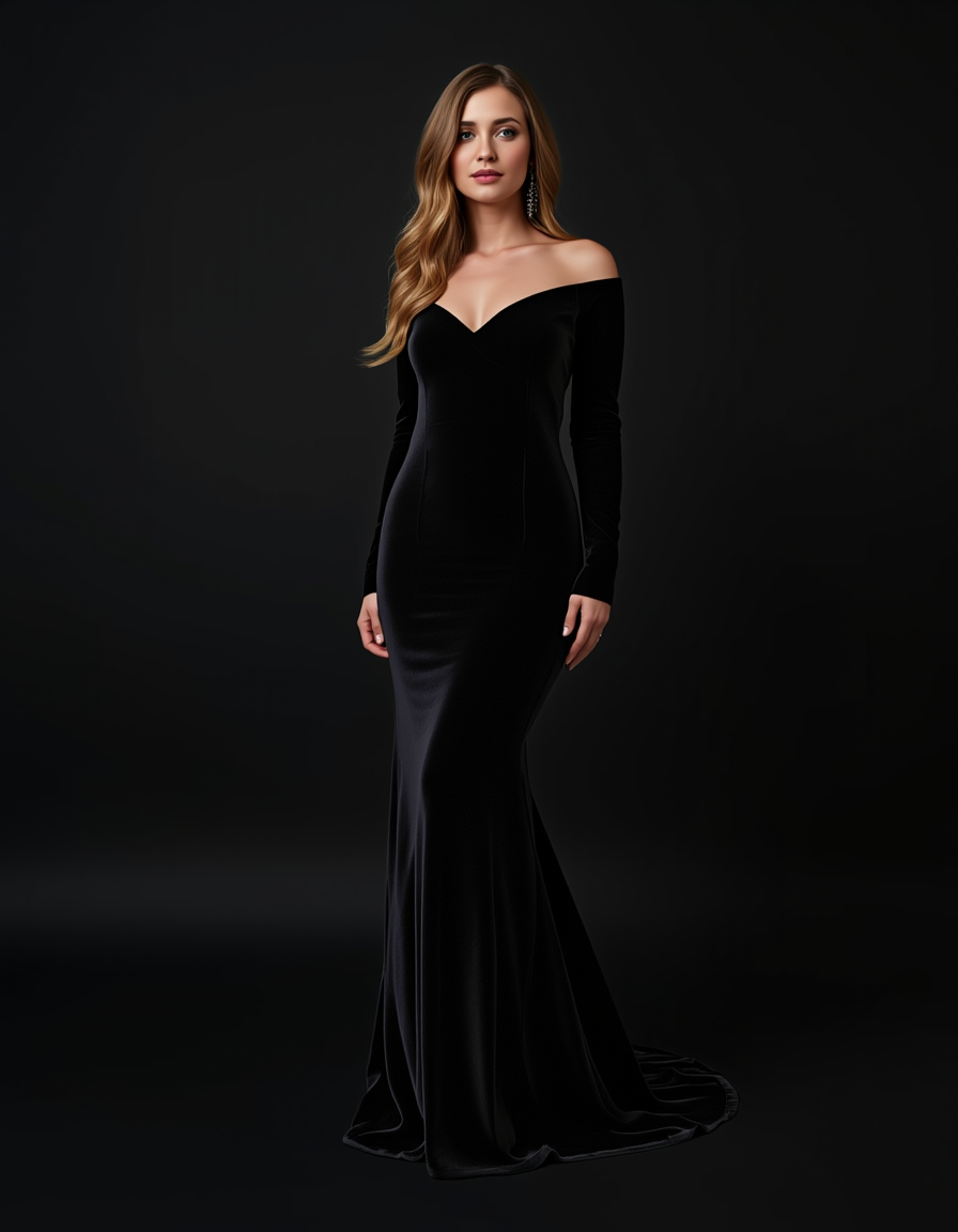Так выглядит по мнению нейросети "Вечернее бархатное платье". Модель "Flux" (AGFlux v1). В следующей статье мы сменим модель работы с моделью, и переключим внимание нейросети с супер-качества изображения, снизив его немного, на сам "дизайн", чтобы сеть больше времени уделяла "фантазии" и внешнему виду самого платья, а не всего, что еще есть в кадре, кроме платья. Вечернее "шикарное" платье по мнению нейросети (