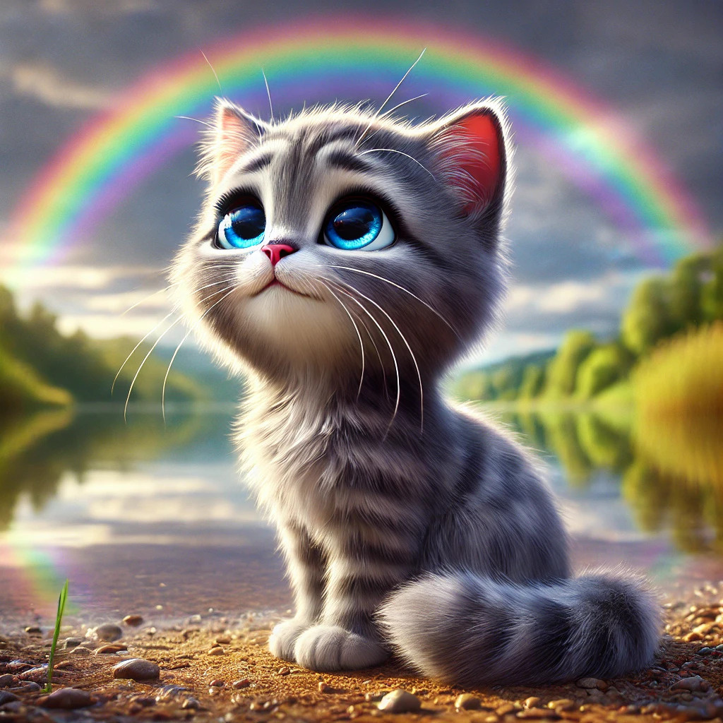 Однажды после дождя, когда лучи солнца снова выглянули из-за облаков, котёнок Мур-Мяу заметил, что небо украшает удивительное зрелище — над деревьями раскинулась яркая радуга. Все ее возможные оттенки цветов сверкали в воздухе, словно кто-то невидимый разлил краски прямо в небе. Мур-Мяу тут же обежал всех своих друзей и собрал их на поляне, чтобы полюбоваться этим чудом.