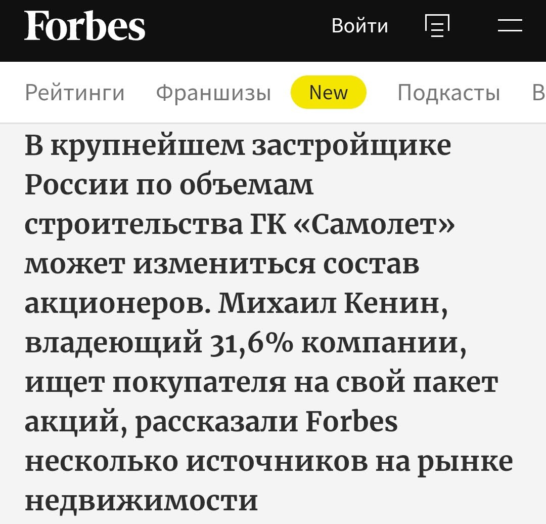 ❗ На днях появилась новость о том, что один из основных акционеров Самолёта Михаил Кенин (владеет 31,6% акций компании) ищет покупателя на свой пакет акций. Хоть это пока и является ничем не подтверждённым слухом, от компании за последние несколько месяцев было немало негативных новостей.