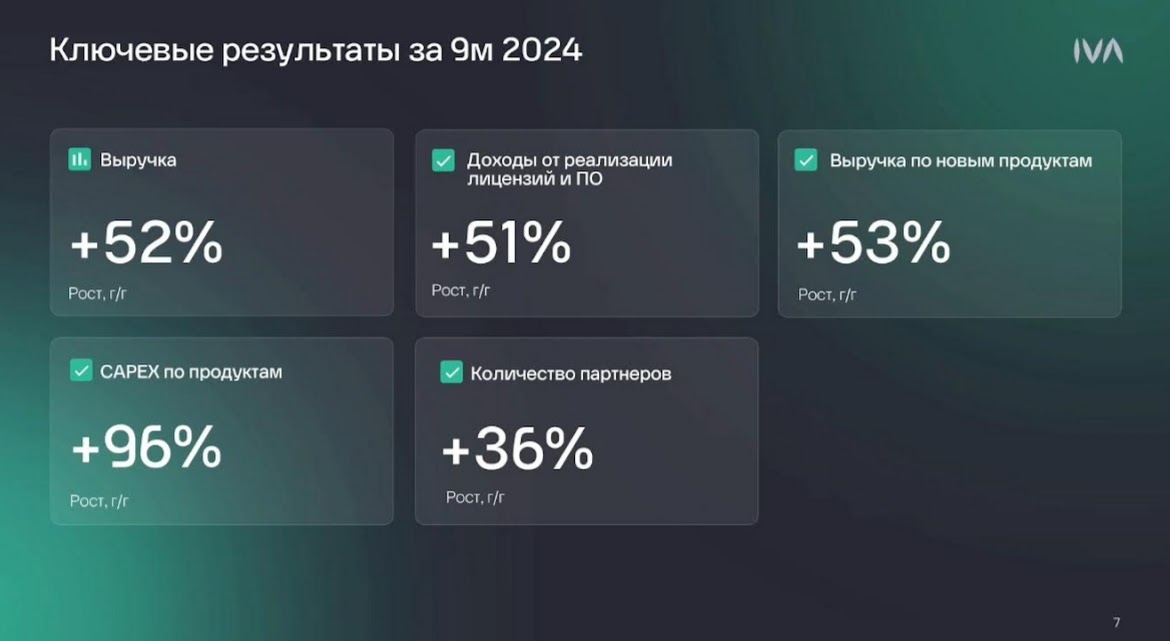 ΠΊΠΎΠΌΠΌΡΠ½ΠΈΠΊΠ°ΡΠΈΠΉ IVA Technologies ΠΏΡΠΎΠ²ΡΠ» ΡΠ²ΠΎΠΉ ΠΏΠ΅ΡΠ²ΡΠΉ ΠΠ΅Π½Ρ ΠΈΠ½Π²Π΅ΡΡΠΎΡΠ°, ΠΏΠΎΡΡΠΎΠΌΡ ΡΠ΅Π³ΠΎΠ΄Π½Ρ ΠΏΡΠ΅Π΄Π»Π°Π³Π°Ρ ΠΎΠ·Π½Π°ΠΊΠΎΠΌΠΈΡΡΡΡ Ρ ΠΊΠ»ΡΡΠ΅Π²ΡΠΌΠΈ ΡΠ΅Π·ΠΈΡΠ°ΠΌΠΈ, ΠΊΠΎΡΠΎΡΡΠ΅ Π±ΡΠ»ΠΈ ΠΎΠ·Π²ΡΡΠ΅Π½Ρ Π½Π° Π΄Π°Π½Π½ΠΎΠΌ ΠΌΠ΅ΡΠΎΠΏΡΠΈΡΡΠΈΠΈ. 1οΈ. ΠΠΎΠΌΠΏΠ°Π½ΠΈΡ ΡΠ°ΡΡΠΈΡΠ½ΠΎ ΡΠ°ΡΠΊΡΡΠ»Π° ΡΠ²ΠΎΠΈ ΡΠΈΠ½Π°Π½ΡΠΎΠ²ΡΠ΅ ΡΠ΅Π·ΡΠ»ΡΡΠ°ΡΡ: - ΠΡΡΡΡΠΊΠ° Π·Π° 9 ΠΌΠ΅ΡΡΡΠ΅Π² 2024 Π³ΠΎΠ΄Π° Π²ΡΡΠΎΡΠ»Π° Π½Π° 52% Π³ΠΎΠ΄ ΠΊ Π³ΠΎΠ΄Ρ, Π² 3 ΠΊΠ²Π°ΡΡΠ°Π»Π΅ ΡΠΎΡΡ ΡΠΎΡΡΠ°Π²ΠΈΠ» 63%. - Π§ΠΈΡΠ»ΠΎ ΠΏΠ°ΡΡΠ½ΡΡΠΎΠ² Π·Π° 9 ΠΌΠ΅ΡΡΡΠ΅Π² ΡΠ²Π΅Π»ΠΈΡΠΈΠ»ΠΎΡΡ Π½Π° 36% Π³ΠΎΠ΄ ΠΊ Π³ΠΎΠ΄Ρ. - ΠΠ°ΠΏΠΈΡΠ°Π»ΡΠ½ΡΠ΅ ΡΠ°ΡΡ