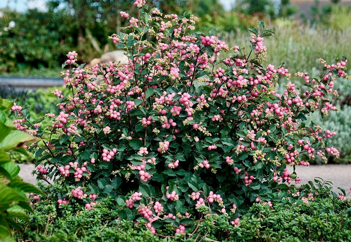 Снежноягодник с яркими розовыми ягодами отлично смотрится на фоне хвойных растений. Высаживается в качестве невысокой живой изгороди для зонирования участка и в композициях с другими растениями.