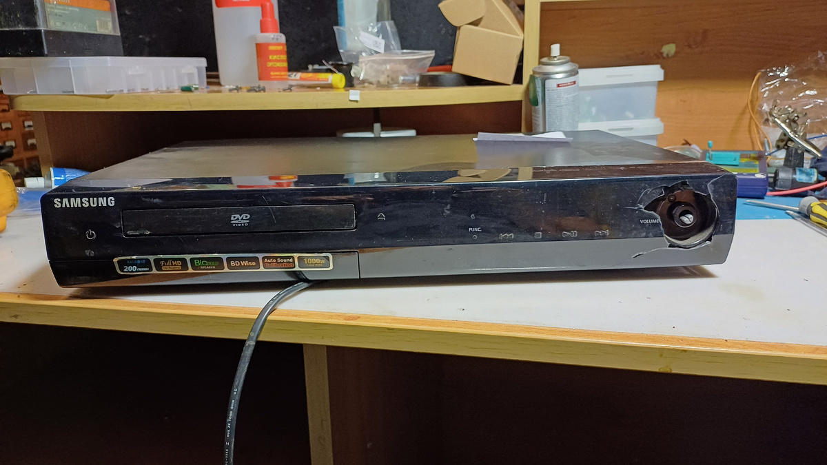 Скоро Новый Год и самые умудренные опытом любители громкой музыки заранее начали задумываться, на чем будут всю ночь слушать хиты, навроде "Толька, рюмка водки на столе" и "куртка Бейна". Зашебуршали в закромах и гаражах в поисках вывезенной туда домашней аппаратуры и акустики. Иначе я не могу объяснить тот факт, что в последнее время аудиотехнику несут в весьма грязном и плачевном состоянии. Ну прямо как наш пациент. Домашний кинотеатр Samsung HT-TZ325 предназначен для воспроизведения звука из различных источников. Радио, CD и DVD диски, USB накопители, внешний источник аудио сигнала. Есть на борту Bluetooth, но самое главное - наличие микрофонных входов и поддержка караоке. Вот что надо в новогоднюю ночь, да и в другой праздник в принципе. И пофиг, что у соседей кровь из ушей может пойти от "профессионального" исполнения главного застольного хита Олега Газманова в исполнении практически любого военнослужащего. Вот и наш аппарат, возможно, не пережил какую нибудь особо кривую ноту. За