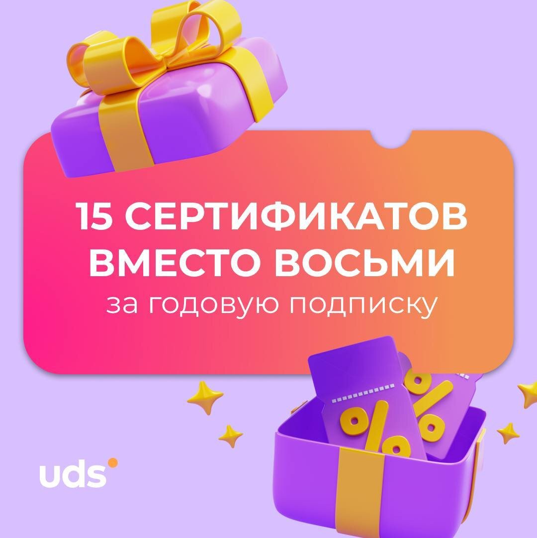 Привет, предприниматель! Напоминаем тебе легальный лайфхак с платформой UDS: Оформляешь годовую подписку до 31 декабря 2024 — получаешь повышенный лимит на сертификаты. НАВСЕГДА. Дарим всем компаниям на тарифе PRO с оплаченной годовой подпиской новый лимит сертификатов. ТЕПЕРЬ ВАМ НАВСЕГДА ДОСТУПНЫ НЕ 8, А ЦЕЛЫХ 15 СЕРТИФИКАТОВ! ДЛЯ ЧЕГО МОЖЕТ ПОНАДОБИТЬСЯ БОЛЬШЕ СЕРТИФИКАТОВ? Масса сценариев: сертификаты на день рождения клиентов, сертификаты для кросс-маркетинга с партнёрами, автоматизированая выдача сертификатов по любому поводу — нужно только настроить! КАК ПОЛУЧИТЬ УВЕЛИЧЕННЫЙ ЛИМИТ? До 31 декабря удостовериться, что у компании оплачена годовая подписка UDS, и написать на support@uds.app письмо с темой «Увеличение лимита сертификатов по годовой подписке». Нет годовой подписки? Зато есть время оплатить её до 31 декабря: напоминаем, что в случае оплаты подписки на год оплачиваются только 10 месяцев — два оставшихся идут в подарок! Твоя Команда UDS Тест драйв UDS - 7 дней : htt