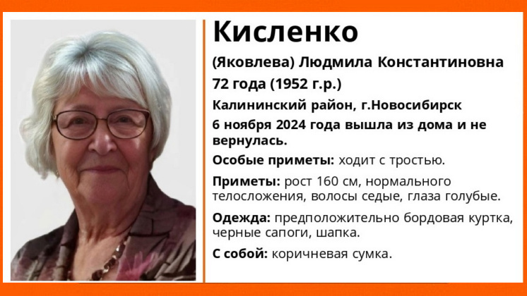 В Калининском районе Новосибирска благополучно завершились поиски 72-летней Людмилы Кисленко, которая 6 ноября 2024 года ушла в неизвестном направлении и пропала. Ее искали волонтеры поисково-спасательного отряда (ПСО) «ЛизаАлерт». Вечером 8 ноября 2024 года стало известно, что пенсионерка жива. Ее жизни и здоровью ничто не угрожает. «Найдена, жива! Спасибо всем, кто принимал участие в поиске!», - кратко написали волонтеры отряда «ЛизаАлерт» в своей официальной группе в социальной сети «ВКонтакте», не уточнив, где все это время была сибирячка. Ранее «Вести Новосибирск» писали, что без вести пропал 40-летний мужчина в камуфляжном костюме.