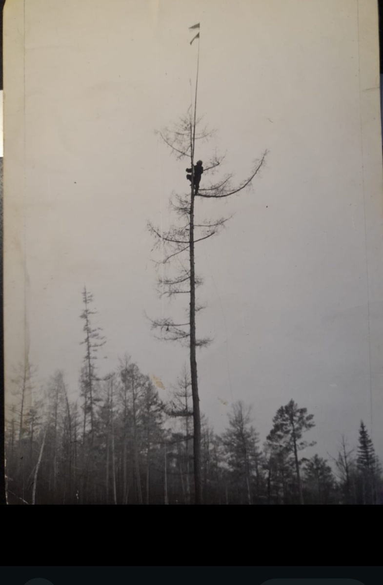 В его обязанности входило ставить вехи на деревья на старых опознаках. Нужно было на специальных когтях залезть по стволу, а я снизу подавал ему на фале веху с флагом, которую он прибивал как можно выше. Но Вовка лез метров пять по дереву и застывал на стволе. Висит, прижавшись, ни вверх ни вниз, трусит. И молчит. В конце концов, всякий раз лез я и делал за него эту работу. На фото установка вехи. Однажды я, в очередной раз отправив его на дерево, не дождавшись результата, исчерпав всё своё красноречие, в сердцах, рявкнул: - Да ты, козёл, будешь, наконец, работать или нет? Знал же, что бывшему зэку такие слова нельзя говорить, но не сдержался, каюсь. Вовка медленно спустился с дерева, отцепил с ног когти, достал нож и пошёл на меня, набычив голову. Я поднял с земли карабин, передёрнул затвор и наставил на него оружие. Сцена была смешной и неприятной одновременно. В глухой тайге, вдали от людей два человека хотят устроить дуэль. Неравную: нож против карабина. Вовка прохрипел, с ненавис