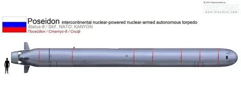Торпедный Аппарат Посейдон, российский беспилотный подводный аппарат торпедного типа, оснащённый ядерным зарядом. Назначение: нанесение гарантированного неприемлемого ущерба прибрежным территориям посредством обширного радиоактивного загрязнения и других факторов ядерного взрыва. Радиус поражения торпеды просто шок: Городок Нью Йорк разнесет за 5 секунд! И это всего лишь одна торпеда! 150 километров, это радиус ужасных повреждений. Данные торпеды установлены на некоторых Российских атомных подводных лодках. Например новейшая подлодка К-329 «Белгород» Считается самой мощной, грозной и лучшей подводной лодкой. так как она носитель подводного беспилотного аппарата Лошарик. также она имеет на борту 6 торпед Посейдон. Подлодка контролирует Мировой Океан. Одна подлодка, выпустив все торпеды может произвести 6 ядерных взрывов в разных местах, Уничтожить Нью-Йорк, нанести сильный ущерб территориям Америки. И ЭТО ВСЕ ОДНА ПОДЛОДКА! Посейдон планируется на многих других новых атомных подводных