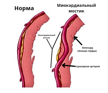- это врожденная аномалия развития коронарной артерии, когда часть ее оказывается внутри миокарда, а не субэпикардиально. В норме крупные коронарные артерии идут, грубо говоря, поверх сердца (т.е. субэпикардиально). При миокардиальном мостике же в каком-то участке артерия "ныряет" в мышцу и через какой-то промежуток "выныривает" из миокарда. Во время сокращения сердца (т.е. в систолу) из-за сокращения миокарда участок артерии "сдавливается", что вызывает сужение артерии -> уменьшение кровотока в отделах после мостика. Симптомы такой аномалии развития могут быть совершенно разные: от никаких до развития инфаркта миокарда Интересно, что для питания сердца кровь поступает именно в момент расслабления сердца (диастолу), а тут проблема возникает в момент сокращения сердца (систолу). Чаще всего "мостики" дают о себе знать при учащении сердцебиения, физических нагрузках, стрессе, спазме артерий. Могут развиться такие симптомы, как: Т.е. это те симптомы, которые могут быть при стенокардии или