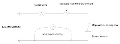 Рис. 1. Подключение милливольтметра. Этап 1. Схема подключается к любому мощному выпрямителю. Держатель электрода и зажим массы замыкаются накоротко. Проволочным сопротивлением устанавливается ток 20 А. Наконечники милливольтметра подключаются к сварочному проводу на таком расстоянии друг от друга, чтобы милливольтметр показывал напряжение 20 мВ. Примечание: если милливольтметр допускает замер меньшего напряжения, чем 20 мВ, ток может быть уменьшен. Главное, чтобы амперы и милливольты совпадали по величине. Рис 2. Измерение тока сварочного инвертора Этап 2. Вместо выпрямителя схема подключается к сварочному инвертору. Амперметр и проволочное сопротивление удаляются. Держатель электрода и зажим массы размыкаются. Ток регулируется потенциометром инвертора. Сварка производится как обычно. Величина тока измеряется милливольтами падения напряжения на сварочном проводе. Видео: "Измерение тока сварочного инвертора"