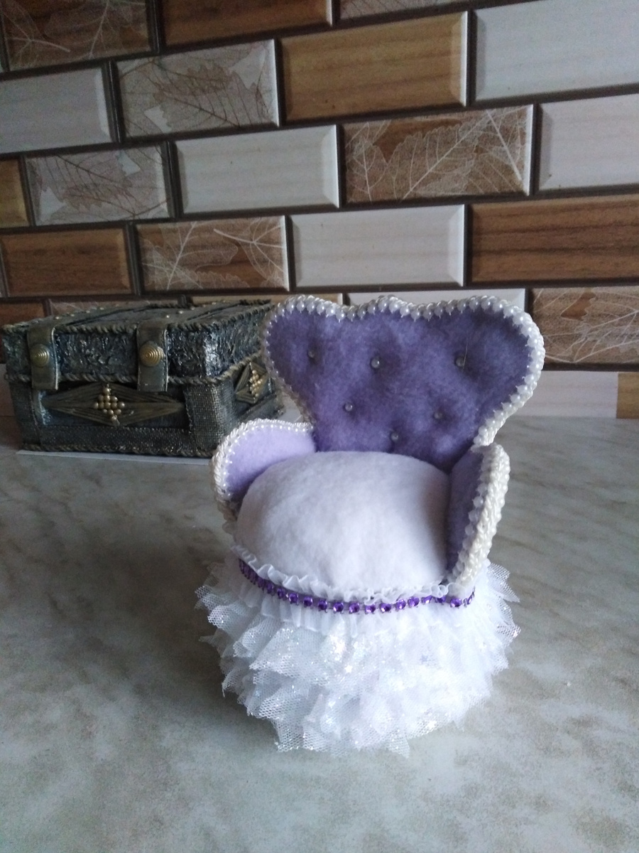 Сегодня закончила подушечку для швейных игл. Сделала её в виде уютного старинного кресла. Материалы вполне доступные - бобина от скотча, картон, фетр, флис, фатин, кружевная тесьма, стразы, жемчуг (полубусины), шёлковый шнур, полимерный клей.