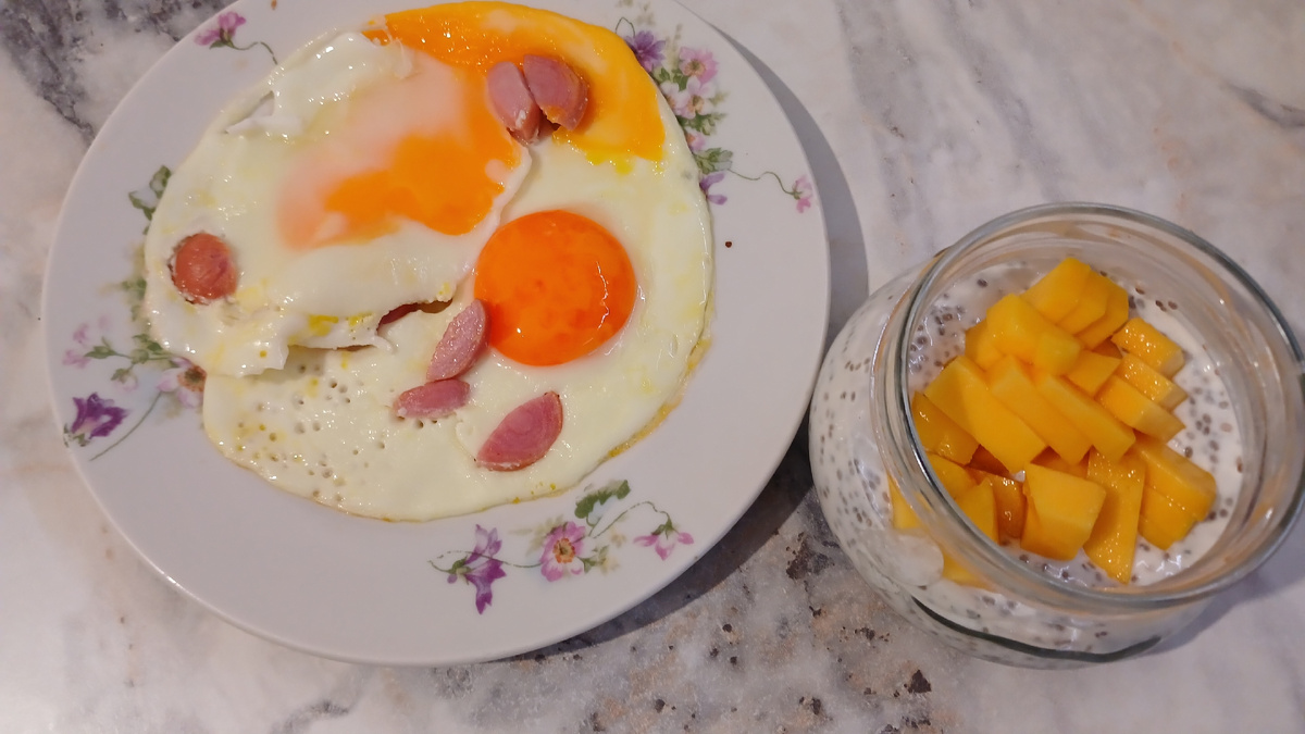 Экономное меню за 233 руб в день К завтраку сделала яичницу-глазунью с сосисками. И чиа-пудинг с манго С вечера смешала в баночках порционно домашний йогурт с семенами чиа. Утром добавила к йогурту манго. А ягоды можно и сразу вечером положить. Такие баночки закрываются крышками и прекрасно хранятся в холодильнике. В любой момент готов полезный перекус. Обед такой же оранжевый, как и завтрак 😀: тыквенный суп-пюре с голубым сыром и семечками и снова чиа-пудинг с манго потом еще чашечка эспрессо с сыром бри и яблочной пастилой Ужин не отстал от завтра и обеда 😊 жареное филе окуня, батат запеченный, брокколи, тушеная тыква с яблоками как десерт и ряженка. Вот такое питание у нас на 233 руб в день 😊 Меню год назад