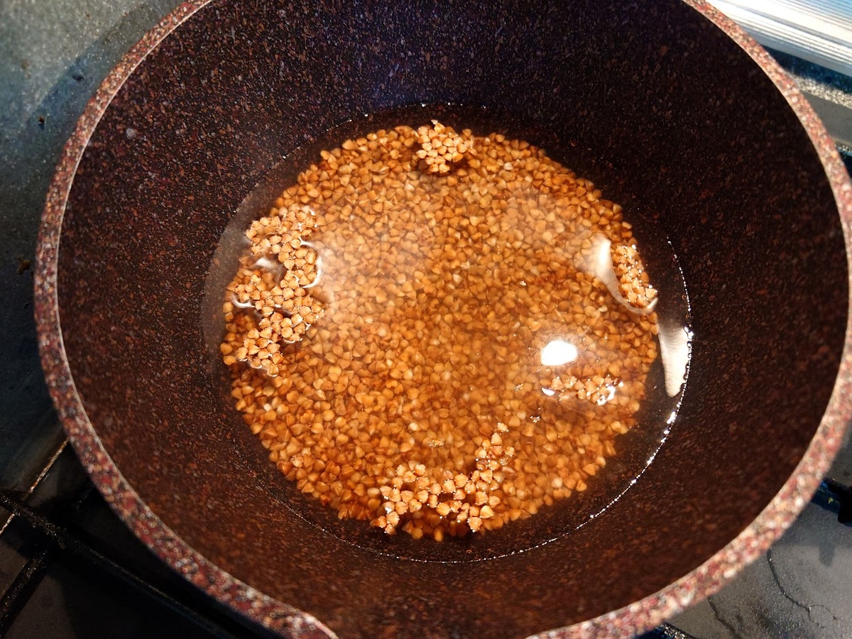 В прошлый раз писала о щах. Сегодня речь о гречневой каше. Как писал знаток русской кулинарии, Вильям Похлебкин, правила кашеварения схожи с математическими – «они точны, ясны, кратки и нетрудны для запоминания». Поэтому действуем так, если хотим приготовить вкусную, рассыпчатую гречневую кашу. В этот раз я взяла 100 грамм сухой крупы. На 100 грамм сухой крупы у меня 200 грамм или 0,2 литра воды (на весах так и оставила граммы). Самое главное в процессе варки каши – не открывать крышку, не мешать, вообще, запретить себе трогать саму кашу. Просто следите за ее состоянием и огнем. Секрет варки каши не в том, что она варится в воде, а в том, что она пропаривается. Поэтому-то так важно строго отмерить объем крупы и воды до начала готовки. В старину гречневую кашу готовили долго. Но не забываем, что это делали в русской печи тогда, когда жар и пыл шли на убыль, а печь остывала после приготовления в ней хлеба. К каше я делаю поджарку из сладкого перца и лука порея. Пассерую на подсолнечном м