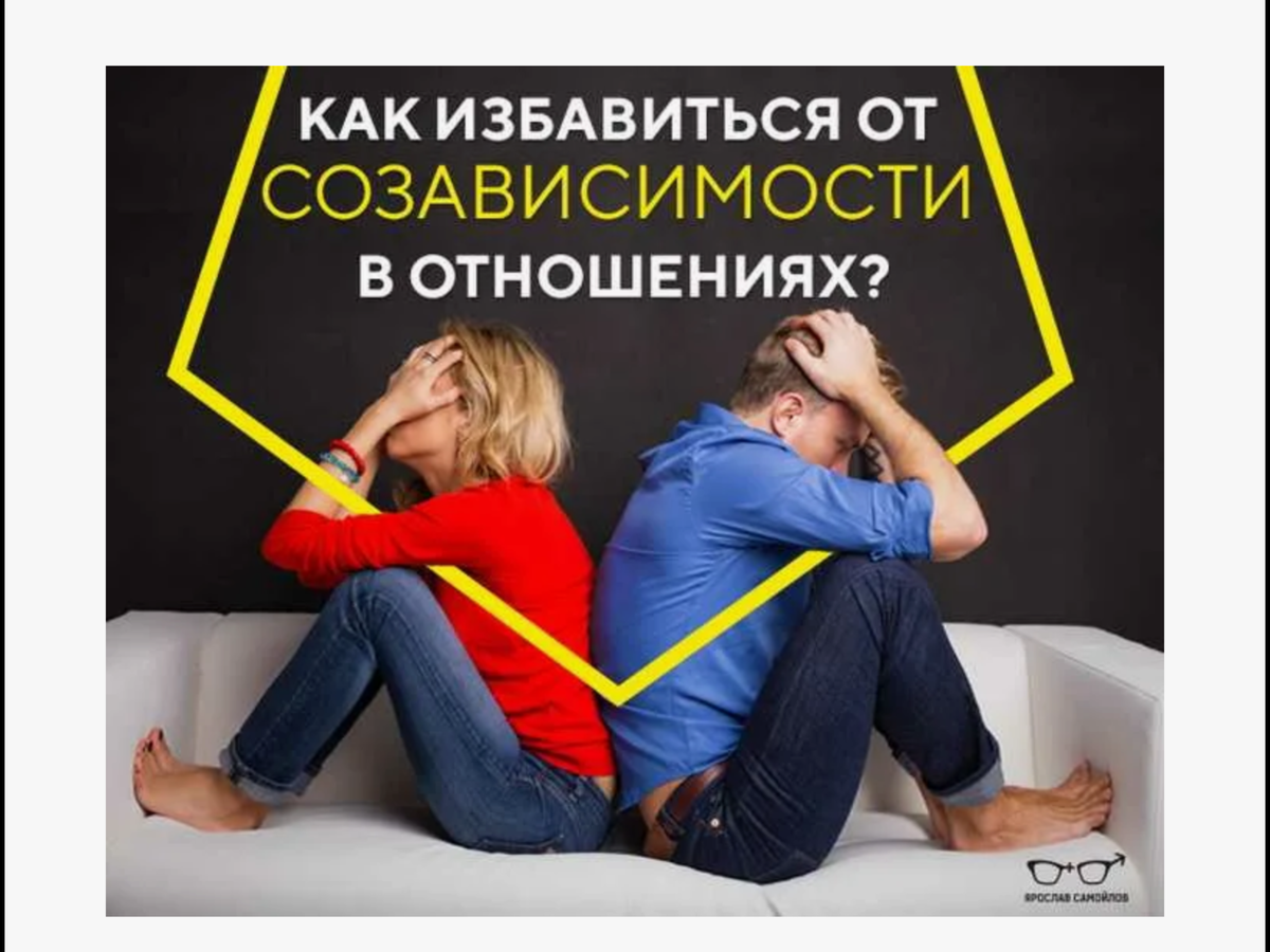 Созависимость- это нездоровая, неадекватная или опасная потребность в другом человеке. Такие отношения могут быть устроены по-разному- иногда оба партнера страдают неадекватно сильной привязанностью друг к другу, а каких-то случаях лишь один из партнеров зависит другого, второй же может даже наслаждаться своей властью и контролем. -неспособны отличить свои мысли и чувства от мыслей и чувств других; -ищете внимания и одобрения других, чтобы чувствовать себя хорошо; -ощущаете беспокойство или вину, когда у других есть проблемы; -делаете все, чтобы угодить другим, даже, когда делать вам этого не хочется; -хнычете или дуетесь, чтобы получить то, что хотите; -живете так, как будто вы-жертва обстоятельств; -не доверяете себе и принятым вами решениям; -испытываете трудности наедине с собой; -вините себя, когда дела идут плохо; -боитесь ошибок; -думаете, что вы недостаточно хороши; -думаете, что кто-то должен измениться для того, чтобы вы изменились сами; -чувствуете, что вам нужно принужд