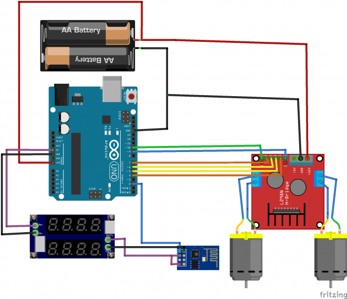 Для своей поделки я использовал двух-колесое шасси с двумя моторчиками, которое купил на "али". Так же мне потребовался модуль управления двигателями на чипе L298N, DC–DC преобразователь LM2596 для питания ESP-модуля, Arduino Uno и ESP8266-01. Схему подключения приведу на картинке. Скажу только то, что ардуинку и ESP-шку я соединил между собой только одним проводом TX-RX соответственно, ибо от ардуинки мне никакой информации получать не надо, вот и было решено, что б не паять лишнего, а там надо было как то решать вопрос с делителем напряжения, так поступить. И немного о питании, для своего проекта я использовал 4 AA батарейки, что в сумме дает 6В, что маловато для стабильной работы, лучшим вариантом будет 9В.