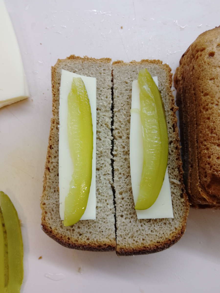 Черный хлеб в беконе с сыром и маринованными огурчиками.