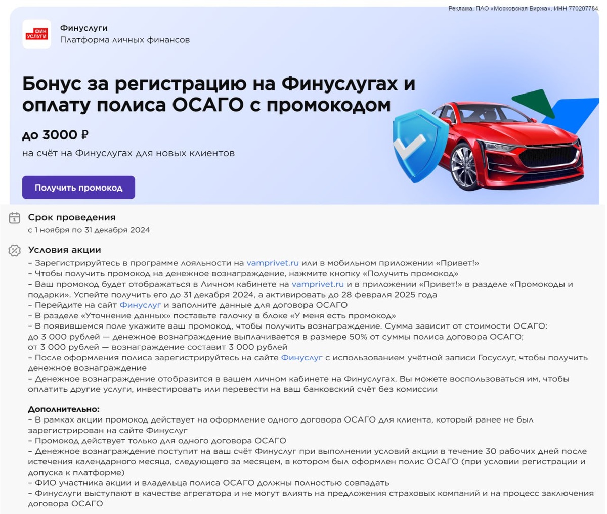 🔸 Акция для клиентов, которые впервые зарегистрировались на «Финуслугах» после 01.11.24.