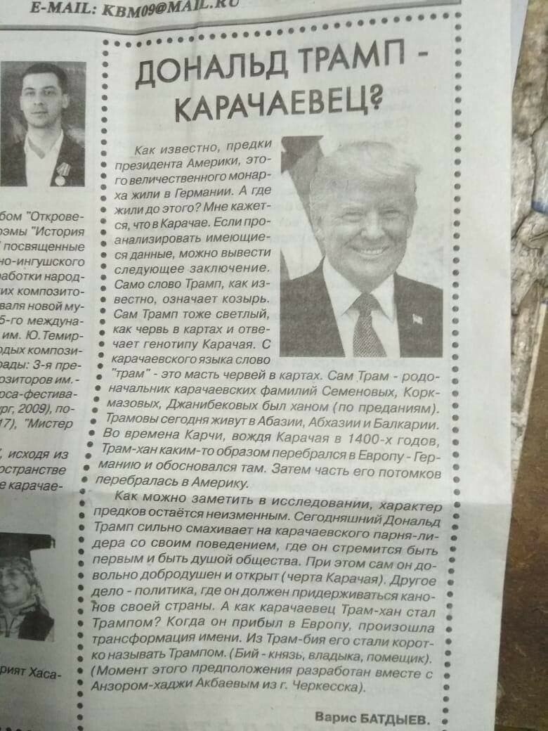 В газете под названием «Карачаево-балкарский мир» в 2020 году вышла статья, которая вновь привлекла внимание в интернете. В статье, написанной Варисом Батдыевым, утверждается, что Дональд Трамп имеет карачаевское происхождение, и это объясняется тремя причинами. Во-первых, как пишет Батдыев, Трамп внешне и по характеру очень похож на карачаевцев – он любит быть лидером. Во-вторых, у карачаевского народа действительно существовал род «Трам». Сегодня представители Трамовых живут в Абазии, Абхазии и Балкарии. Один из карачаевских лидеров, Трам-хан, в 1400-х годах переселился в Европу, в Германию, а его потомки впоследствии перебрались в Америку. Известно, что предки Дональда Трампа были немцами и происходили из Германии.