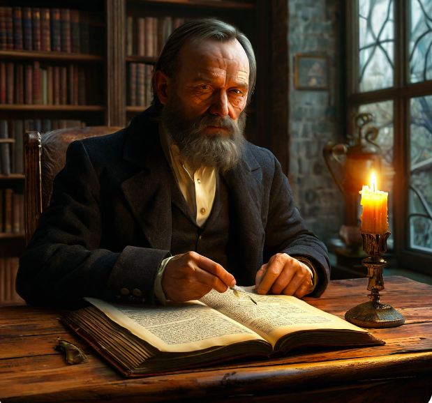 Он ищет сюжет, читает в газетах уголовные хроники и узнает о случае убийства старухи топором из статьи в газете "Городской обозреватель" за 1866 год. Этот инцидент вдохновил его на написание романа "Преступление и наказание".