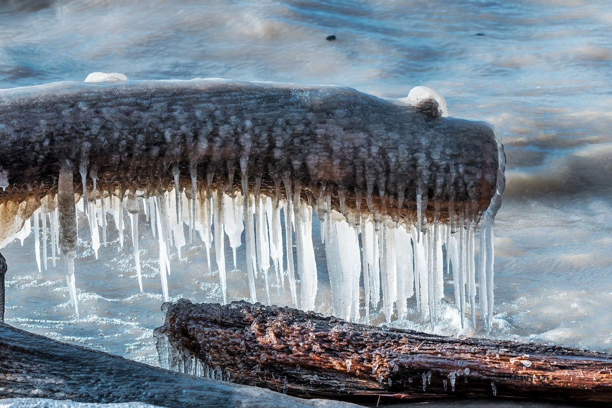 Бердск. Штормовой ветер хулиганил в городе, но на берегу Обского моря творил сосульки. 9 ноября 2024 год.