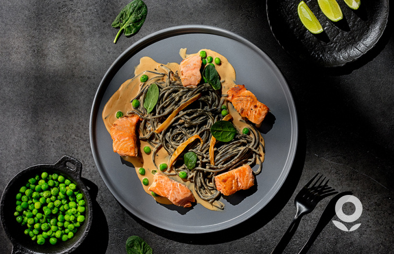 Самые необычные ингредиенты доступны в «Ленте» по выгодным ценам: — 150 г чёрных спагетти — 1,5 ст. л. оливкового масла — 150 г филе лосося — 1 сладкий оранжевый перец — 2 зубчика чеснока — 2 веточки орегано — 60 г замороженного зелёного горошка — 45 мл белого сухого вина — 200 г сливочного соуса терияки — соль 1. Варите спагетти в кипящей подсоленной воде 9–10 минут согласно инструкции на упаковке до состояния аль денте. Откиньте на дуршлаг и сбрызните 1/2 ст. л. оливкового масла. 2. Филе лосося нарежьте средними кусочками. Разогрейте оставшуюся 1 ст. л. оливкового масла в сковороде и обжаривайте рыбу на сильном огне 2 минуты, помешивая. В конце немного посолите. Переложите рыбу на тарелку. 3. У перца удалите плодоножку, семена и перегородки. Нарежьте стручок тонкой соломкой. Чеснок раздавите, очистите и измельчите. Листики с 1 веточки орегано отделите от стеблей и мелко порубите. 4. В ту же сковороду, где жарился лосось, выложите перец, че
